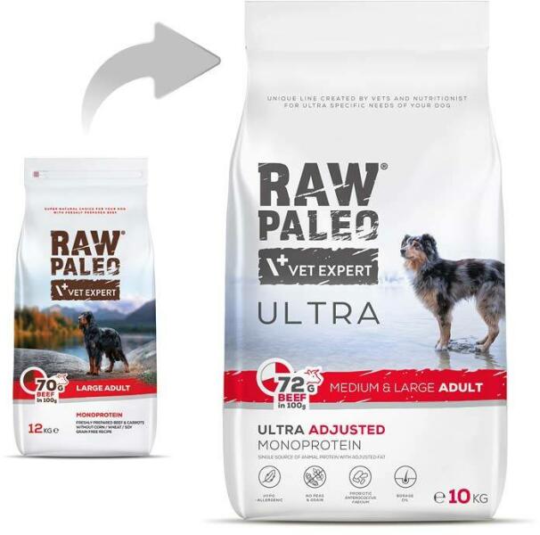 Raw Paleo Ultra Medium & Large Adult Beef egy teljes értékű eledel felnőtt közepes és nagytestű kutyák számára (12 hónaposnál idősebb közepes fajták esetében vagy 15 hónaposnál idősebb nagytestű fajták esetében), 8 kg feletti testtömeggel. Hipoallergén és monoprotein eledel, ami azt jelenti, hogy csak egy állati fehérjeforráson (marhahús) alapul, és egy adaptált