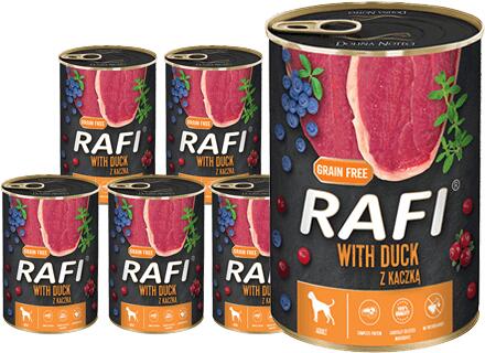 Dolina Noteci Rafi kacsával 400g - Leírás Teljes értékű nedves eledel minden fajta felnőtt kutyának kacsával. Ez a Rafi nedves eledel a kacsából származó hús és állati eredetű nyersanyagok felhasználásának köszönhetően teljes értékű fehérjeforrás, amely tartalmazza az összes esszenciális aminosavat. A kacsaeledel megfelelő arányban tartalmaz szelént, rezet és vasa