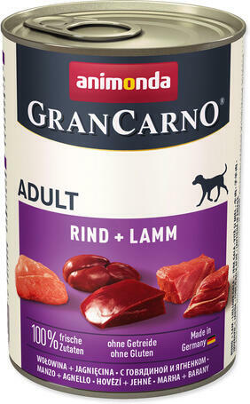 Az Animonda GranCarno Adult (marha + bárány) egy ízletes, teljes értékű nedveseledel felnőtt kutyáknak. Felnőtt kutyáknak 1-6 éves kor között. Csirkehús- és gabonamentes eledel, így ideális választás érzékeny gyomrú, vagy táplálékintoleranciával küzdő kutyusok számára. Isteni marhás és bárányos ízkombináció: - A marhahús jól hasznosuló izomhús, esszenciáli