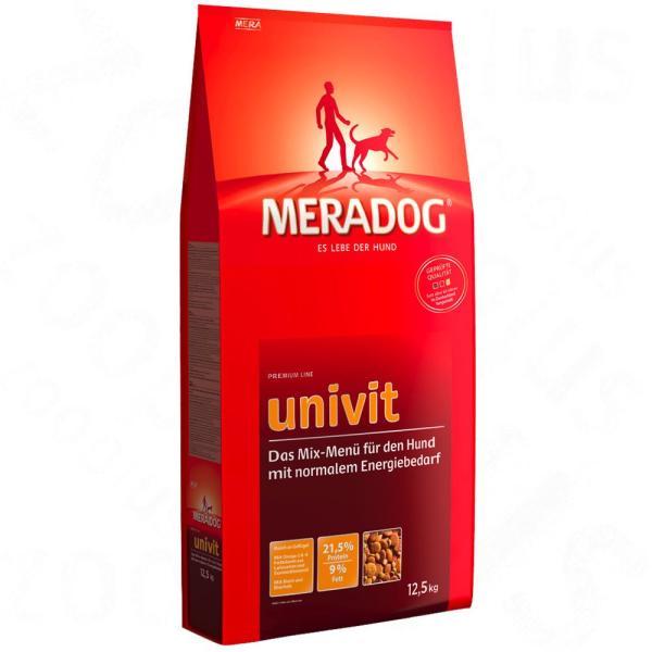 A Meradog Univit kutyatáp kiváló minőségű vegyes étrendet kínál húskrokettekkel, zöldség- és gabonapehellyel. A Meradog Univit teljes mértékben kielégíti az átlagos, normál aktivitási szintű kutyák (sétákon részt vevő, kíséretet nyújtó kutyák, valamint kisebb teljesítményű sport- és munkakutyák) energia- és tápanyagigényét. Az élelmiszeriparban a Mera név