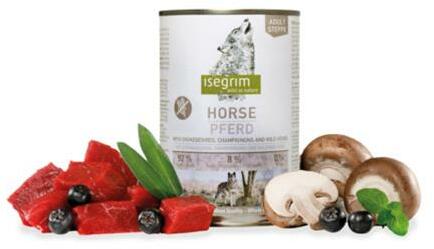 ISEGRIM kutya Adult Mono Horse pure fekete áfonyával, Champignon & vadon termő gyógynövényekkel bal. 6 x 400 g-os konzervdoboz