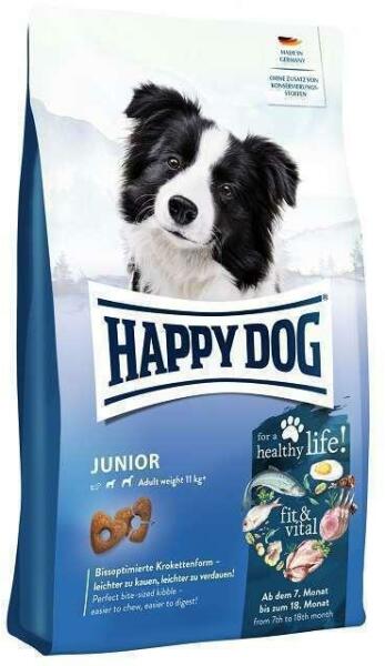 A Happy Dog Supreme Young Fit & Vital JUNIOR egy teljesértékű eledel normál energiaszükségletű közepes- és nagytestű fiatal kutyák számára 7 hónapos kortól 18 hónapos korig. Összetétel:Baromfifehérje* (17%), rizsliszt, kukoricaliszt, bárányfehérje* (5%), baromfizsír, töpörtyű, halliszt (5%, ebből 50% lazacliszt), napraforgóolaj, melaszos cukorrépaszelet* (cukorment