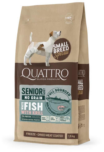 Teljesértékű száraz, súlykontroll táp kistestű idősödő kutyáknak, 10 éves kor felett. Fagyasztva szárított, NYERSHÚS BEVONATTAL! – GABONAMENTES, GMO- és GLUTÉN MENTES! Fehérhúsú halakkal és krillel FAGYASZTVA SZÁRÍTOTT HÚSBEVONATTAL. A Quattro termékválaszték innovatív "fagyasztva szárított húsbevonat" technológiával készül. Ez az exkluzív megoldás lehetővé
