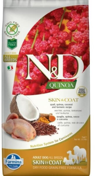 N&D Quinoa Dog Skin & Coat Fürj 7kg SKIN COAT - Fürj, quinoa, kókusz és kurkuma. Teljes értékű, gabonamentes eledel felnőtt kutyák részére. Az N D Quinoa Skin Coat egy teljes értékű diétás eledel kutyák számára, valamely összetevővel vagy tápanyaggal szembeni érzékenység csökkentésére. Használati utasítás: Adagolja az eledelt a táblázatban feltüntetett nap