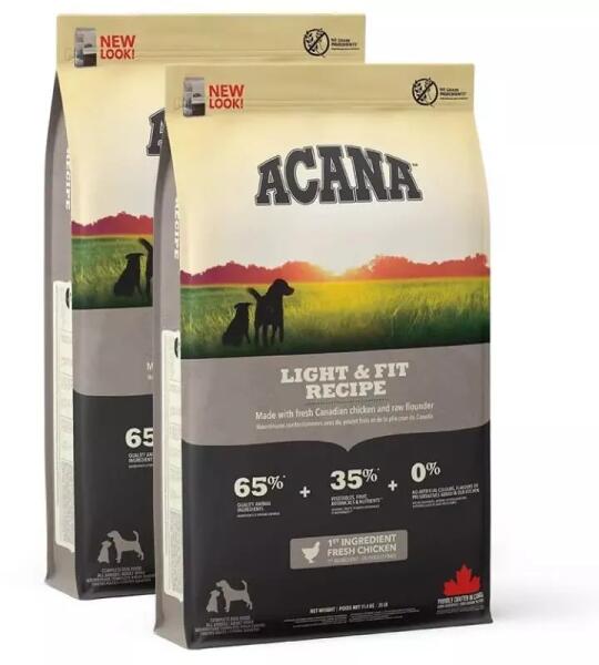 Acana Light & Fit száraz kutyatáp Az Acana Light & Fit száraztáp gabona- és gluténmentes, prémium eledel túlsúlyos kutyáknak magas fehérje- és kevés szénhidráttartalommal, regionális összetevőkből, 65% hús részarány - abból 1/3 friss hús, zöldséggel és gyümölccsel. Miért van szüksége a túlsúlyos kutyának az Acana Light & Fit száraztáp adagolására?