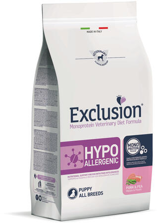 Az Exclusion Diet Hypoallergenic Pork and Pea PuppyEgy teljesértékű diétás eledel kölyökkutyák számára, melyet az összetevők és a tápanyag intollerancia csökkentésére fejlesztettek ki. HYPOALLERGENIC: táplálási támogatás nem kívánt táplálékreakcióval küzdő kutyáknak MONOPROTEIN FORMULA: egyetlen állati eredetű fehérjeforrás tartalom, a táplálék intolerancia mi