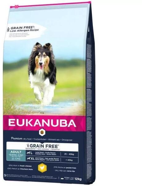 Eukanuba Adult Large Grain Free Chicken 12kg - Termékleírás. Az EUKANUBA Grain Free* felnőtt nagy és óriás fajtájú kutyák számára készült eledel csirkehússal. Az összetétel antioxidánsokat és vitaminokat tartalmaz az immunrendszer megfelelő működéséért, valamint gluténmentes* jamgyökeret természetes rost- és ásványi anyagforrásként. Répapépet és FOS prebiotikumo