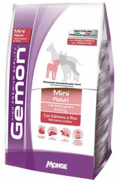 Kutya eledel GEMON Dog Mini Adult felnőtt kis testű lazac-rizs száraztáp Teljes értékű, könnyen emészthető száraz kutyaeledel kistestű kutyák számára. Összetevők - Gabonafélék (ebből legalább 5% rizs) - hal és haltermékek (legfeljebb 10% friss lazac) - húskészítmények 24% - olajok és zsírok (legfeljebb 3% lazacolaj) - hidrolizált állatok fehérje - növényi eredetű