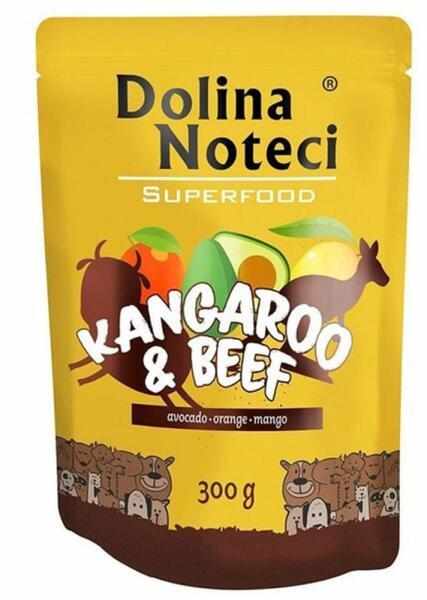 A Dolina Noteci Superfood nedves kutyaeledel 80%-ban tartalmaz húst és állati eredetű termékeket (40% kenguru, 40% marhahús). A receptúra friss gyümölcsöket és természetes adalékanyagokat is tartalmaz, amelyek rendkívül magas biológiai hatóanyag-tartalommal rendelkeznek - pozitívan hatnak a kutya szervezetére, mint például az új-zélandi kagyló vagy a tengeri moszat. A diet