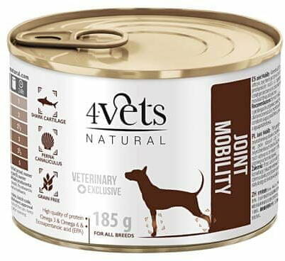 A 4vets Joint Mobility teljes értékű állatorvosi kutyatáp az ízületi és porcízületi gyulladásban szenvedő kutyák számára készült. A megelőzés részeként is ajánlott az ilyen típusú betegségre hajlamos fajtáknál. Megelőzi az elhízást, amely a kutyák csont- és ízületi problémáinak egyik fő oka. Fehérjeforrásként alacsony zsírtartalmú pulykahús és marhahús