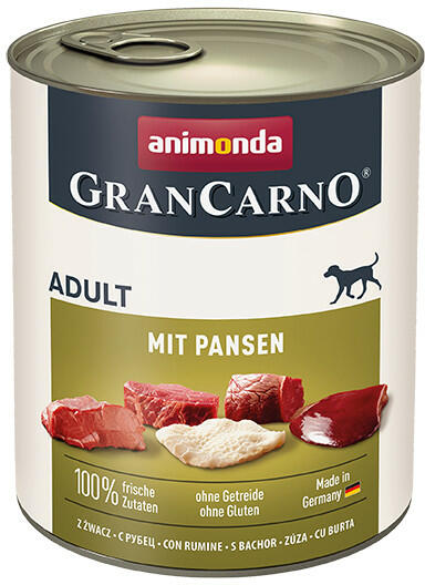 A GranCarno® Adult a kiegyensúlyozott, ízletes és egészséges táplálkozást jelenti a legmagasabb szinten 1-6 éves felnőtt kutyák számára. A válogatott, friss hús összetevők garantálják azt a páratlan ízt, amelyet a kutyák annyira értékelnek. A GranCarno Adult minden szükséges tápanyagot biztosít a felnőtt kutyának. Összetétel: 48% sertéshús (szív, máj, tüdő, h