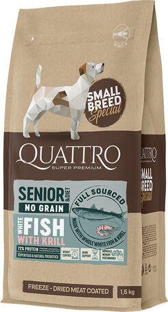 14kg Teljesértékű lazachúsos szárazeledel kistestű idős kutyáknak, fagyasztva szárított nyerhúsból készült bevonattal. A Quattro termékválaszték innovatív "fagyasztva szárított húsbevonat" technológiával készül. Ez az exkluzív megoldás lehetővé teszi, hogy a szemcséket fagyasztva szárított hússal vonják be, biztosítva, hogy kutyád imádja az eledelét. Búza, sz