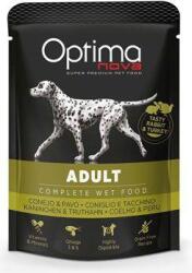 Optima Nova Dog Adult Nyúl & pulyka zseb 300g, 100%-ban természetes összetevőkből készült. Táplálkozási szempontból kiegyensúlyozott nyúl- és pulykahússal. Kiváló minőségű fehérjék, szénhidrátok és tápanyagok összetétele. Jótékony A- és D3-vitaminnal gazdagítva, omega 3 és 6 vitaminokkal kombinálva az egészséges ízületekért, bőrért és fényes szőrzet
