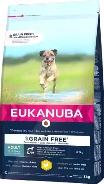 Eukanuba Adult Small&Medium Grain Free Chicken 3kg - TermékleírásAz EUKANUBA Grain Free* friss csirkében gazdag eledel felnőtt kis és közepes méretű fajtájú kutyák számára, amely segít megőrizni a sovány izomzatot. Az összetételben antioxidánsok és vitaminok is szerepelnek az immunrendszer megfelelő működéséért, valamint gluténmentes* jamgyökér természetes rost-