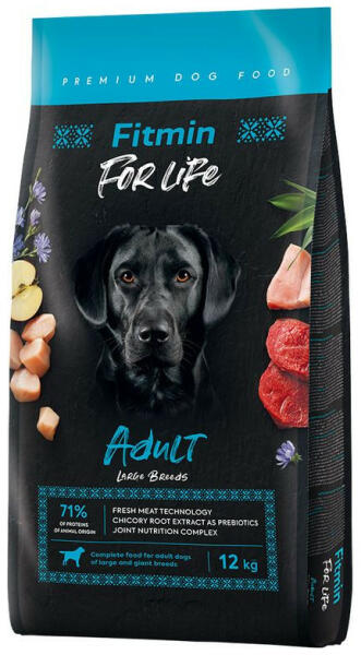 Rendkívűl jó minőségű, magas tápanyagtartalmú csirkéskutyatápnagytestű felnőtt kutyák részére amely figyelembe veszi a nagy testömeg által támasztott igényeket. A Fitmin Dog for Life Adult Large Breed a 15-18 hónapos és 7 éves kor közötti nagytestű kutyák igényeire szabott szárazeledel. Összetétel Hús (szárított baromfihús 22%, friss hús/baromfi, sertés, marha 2