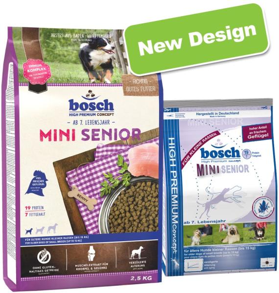 A Bosch Mini Senior ideális száraztápot kínál 7 év feletti, kis méretű kutyáknak, hisz erősen csökkentett energia-, fehérje- és nyersanyagtartalmú és búza nélkül készül. Ezáltal az idősebb kutyák súlygyarapodásának esélye kisebb, s a sejtek öregedése is lelassul ill. későbbre tolódik. A glükánokat & mannánokat tartalmazó immun-komplex felhasználásával az