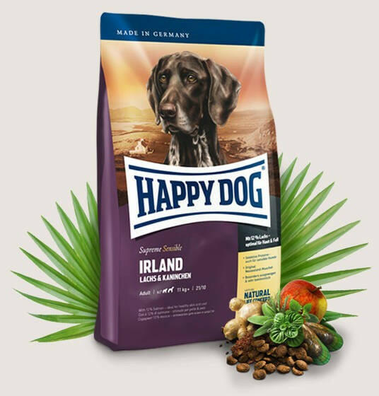 Kiváló minőségű száraztáp felnőtt (11 kg felett), táplálékérzékeny , normál energiaigényű kutyáknak. Happy Dog Supreme Sensible Irland - Ízletes lazac és finom nyúl szolgáltatják a jól emészthető állati fehérjéket és kellő mennyiségű energiát. Az eledel kíméletes módon készül, fehérje- és energia-részaránya a táplálék érzékeny kutyák különleges ig