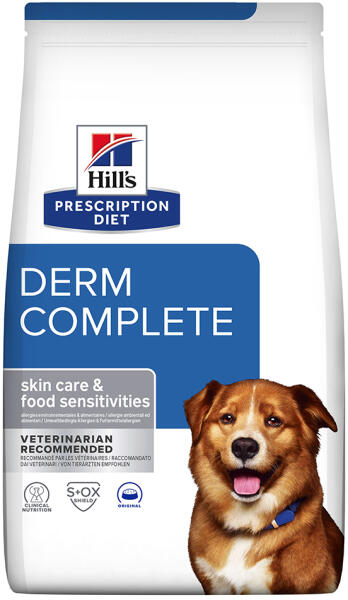 Hill's PRESCRIPTION DIET Derm Complete kutyaeledel. A Hill's PRESCRIPTION DIET Derm Complete kutyatáp az egyetlen klinikailag bizonyított eledel, amely eleségallergia és környezeti allergia kezelésére is használható. Ez az érzékeny bőrre kifejlesztett táp az egyetlen terápiás eledel, amely 3 klinikai vizsgálat eredményei alapján diétás támogatást nyújt mindkét allergiatípu