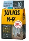 JULIUS K-9 Grain Free Utility Dog Hypoallergen Adult Small Vaddisznó áfonya – Teljes értékű, vaddisznóhúsból valamint marha és lazachúsból készített, gabonamentes kutyatáp – gyógynövényekkel, spenóttal, és glükozaminnal dúsítva – bármely kistestű felnőtt kutya részére. A tápsorozatot alkotó mindhárom állati fehérje hipoallergén húsforrás, amely alkalmas a c