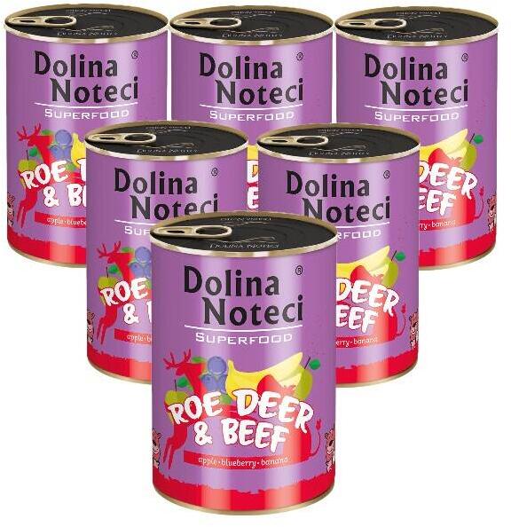 A Dolina Noteci Superfood nedves kutyaeledel 80%-ban tartalmaz húst és állati eredetű termékeket (40% szarvas, 40% marhahús). A receptúra friss gyümölcsöket és természetes adalékanyagokat is tartalmaz, amelyek rendkívül magas biológiai hatóanyag-tartalommal rendelkeznek – pozitívan befolyásolják a kutya szervezetét, mint például az új-zélandi kagyló vagy a tengeri mosza