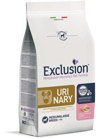 Az Exclusion Diet Urinary Pork and Sorghum and Rice felnőtt ebek részére készült teljes, dietetikus élelem struvit alapú számítások végzésére és struvit számítások visszaesései csökkentésére. Ez a diétás élelem vizelet savanyító hatású, alacsony magnézium koncentrációval és csökkent tartalmú, de minőségi proteinnel. URINARY : étrendi támogatás struvit húgyk