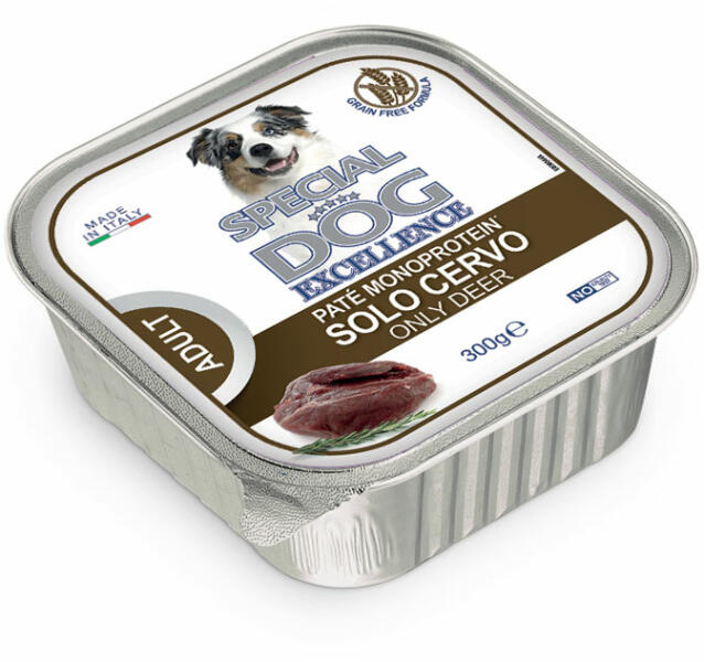 Minimum rendelhető mennyiség: 6 db Special Dog Excellence Monoprotein Cervo Szarvashúsos pástétom felnőtt kutyáknak. Special Dog Excellence Monoprotein Cervo Szarvashúsos pástétom felnőtt kutyáknak. -100% Szarvas , kizárólag friss vágású szarvasból készül -szója, növényi adalékok, színezék és tartósítószerek hozzáadása nélkül -egyetlen proteinforrást tartalmaz ez