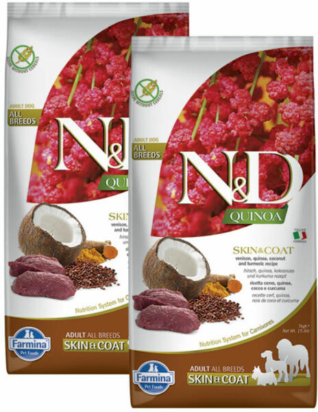 Az N&D Dog Quinoa Skin&coat Venison (szarvas) további jellemzői: Sza rvas: soványhús, alacsony koleszterin tartalommal. Vasban, B12, B3, B6 vitaminokban gazdag és a halhúshoz vagy magvakhoz hasonló mennyiségű Omega-3 és Omega-6 zsírsavakat tartalmaz. Gyógyhatású növények: aloe vera, zöldtea és rozmaring, melyek magas antioxidáns tartalmú gyógynövények. Kiváló minő