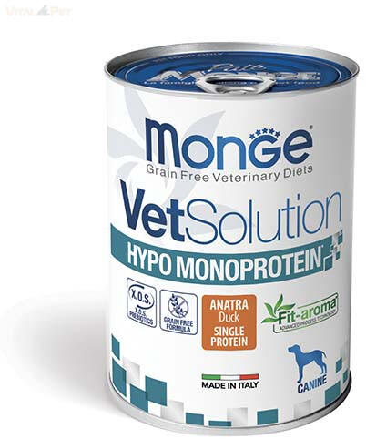 Monge VetSolution Canine Hypo Monoprotein Duck: Egyetlen fehérjeforrás (kacsa) miatt ideális érzékeny kutyáknak. Gabona-, szójamentes, hipoallergén. Monge VetSolution Canine Hypo Monoprotein Duck 400g – Kényeztesse érzékeny kutyusát! A Monge VetSolution Canine Hypo Monoprotein Duck egy speciálisan kifejlesztett, teljes értékű nedves táp, amely kizárólag egyetlen fehérjeforrá
