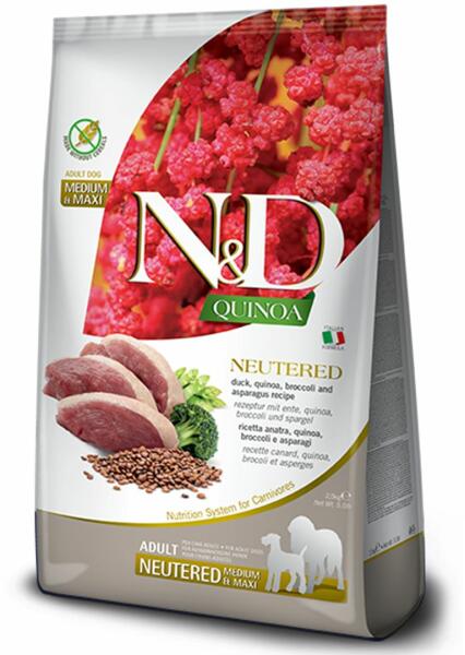 Gabonamentes kiegyensúlyozott eledel kacsahúsból, kínoa magokkal, brokkolival és spárgával közepes és nagytestű felnőtt ivartalanított kutyák számára. a gabonamentes eledel ideális választás étel-túlérzékenységben vagy gabonaallergiában szenvedő egyedek számára a kínoa a világ egyik legegészségesebb eledele, az egészséges anyagok magas tartalmának köszönhetően,