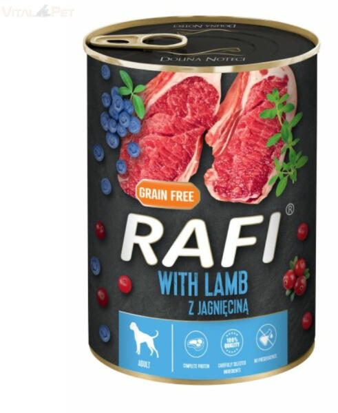 RAFI konzerv paté 400 g bárány&áfonya Teljesértékű nedves kutyaeledel felnőtt kutyák számára, 65% hústartalommal és gabonamentes összetétellel. ÖSSZETÉTEL: Hús és állati származékok 65% (bárányhús 4%), gyümölcsök (Észak Amerikai kékáfonya 2%, vörösáfonya 2%), ásványi anyagok, olajok és zsírok (lenmagolaj 0.2%), szárított kakukkfű 0.01%. ANALITIKAI ÖSSZ