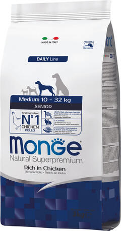 3kg Monge Daily Line Dog Medium Senior (26/13) teljes értékű állateledel közepes méretű (10-32 kg) idős kutyák számára. A kiváló minőségű alapanyagoknak és az olasz kutatómunkának köszönhetően egészséges táplálkozást biztosít kutyájának. A recept xylo-oligoszacharideket és probiotikumokat tartalmaz, amik támogatják a megfelelő bélműködést. Ezenkívül a termé