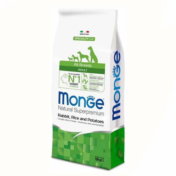 Kutya eledel MONGE Dog Rabbit Rice and Potatoes Teljes értékű szuperprémium állateledel nyúllal, rizzsel és burgonyával minden méretű felnőtt kutyák napi etetésére. Elősegíti az emésztőrendszer megfelelő működését. Articsóka kivonatot, echinaceát, oregánt és fokhagymát tartalmaz, melyek serkentik az immunrendszert és védik a májat. Ügyeljen arra, hogy bőséges tisz
