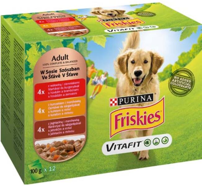 Friskies Dog Adult csirkéskacsáspulykás 12 x 85gNedves kutyaeledel Purina Friskies Felnőtt VitaFit marha- és burgonya- csirke- és sárgarépa- bárány- és sárgarépa-mártás Teljes étel felnőtt kutyák számára Mesterséges színezékek hozzáadása nélkül aPurina Friskies Vitafit támogatja kutyája egészségétEllenőrizze háziállata életképességét- Kompakt széklet az egé