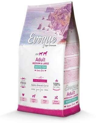24kgVisán Evoque Dog Adult Medium/Large White Fish with Fruits & Vegetables Grain Free (26/14,7) teljes értékű gabonamentes eledel fehér hallal közepes (12 hónapos kortól) és nagytestű (18 hónapos kortól) felnőtt kutyák számára.
