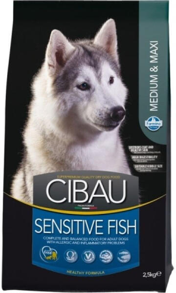 Cibau Sensitive Fish Medium & Maxi Teljes értékű, kiegyensúlyozott eledel közepes és nagy testű felnőtt kutyák részére. Segít az allergiás és gyulladásos problémák megoldásában. Összetevők: rizs (55%), dehidratált hal (28%), halolaj (8%), szárított cukorrépa pép (5%), növényi olaj (2%), mono-dikalcium-foszfát, nátrium-klorid, kálcium-karbonát, kálium-klorid, sz