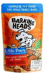 BARKOLÓ FEJEK Litt. Mancs Nyalós Csibe+Tur kapszula150g, Teljes értékű nedves eledel Barking Heads felnőtt, kistestű kutyáknak 10 kg-ig. A tasak friss pulyka- és csirkehús, zöldségek és fűszernövények keverékét tartalmazza. Összetevők:Friss csontozott csirke (35%), csirkehúsleves (25%), friss csontozott pulyka (15%), friss csontozott sertéshús (10%), sárgarépa, édesburgon