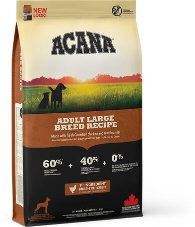 34kg Az Acana Adult Large Breed egy teljes értékű száraz kutyatáp nagytestű (25 kg felett) felnőtt kutyák számára. A termék párját ritkítóan sokféle helyi alapanyagból készül, melyeket az üzem környéken tenyésztenek, halásznak vagy termelnek. Kizárólag megbízható partnerektől vásárolnak közvetlenül, ezért az élelmiszerlánc a lehető legrövidebb. Az alapanyagok