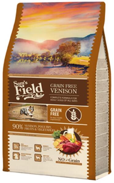A Sam's Field Adult Grain Free Venison egy teljesértékű állateledel felnőtt kutyák számára. Jellemzők: - gabonamentes - 90% szarvas, baromfi, gyümölcs és zöldség Összetétel: Szarvas 24% (14% szarvasliszt, 10% friss szarvas), pulyka 22%, burgonya 22%, baromfi zsír (kevert tokoferolokkal tartósítva, E-vitamin forrás) 10%, sárgaborsó 8%, szárított alma 6%, lazacolaj 3%, csirke