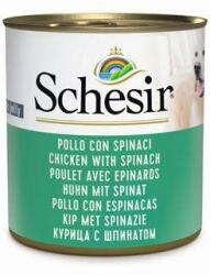 Schesir Dog Cons. Felnőtt csirke/spenót 285g, A Schesir húskonzerv kiváló minőségű húsdarabokból készül, amelyeket finom zselébe mártanak. A húsdarabok a könnyű fogyasztás érdekében morzsolva vannak, de mindig valódi húsdarabok, nem daráltak. A sűrű zselének köszönhetően az állaga lágy, az íze pedig teljesen ellenállhatatlan. Minden kutya imádni fogja a Schesir-t.