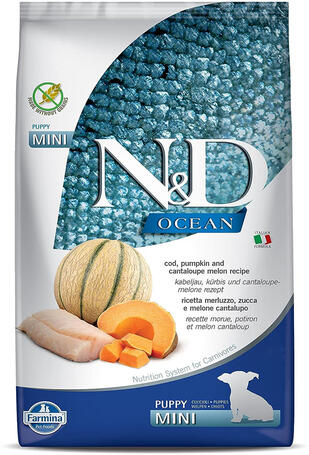 14kg Az N&D Dog Ocean Puppy Mini (Grain Free) sütőtökös, tőkehalas és sárgadinnyés kutyatáp egy szuperprémium eledel kistestű kölyök kutyák részére. Ezen teljesen gabonamentes kutyatápban megtalálhatóak mindazon prémium összetevők, amelyek hozzájárulnak kutyánk egészségének és vitalitásának megőrzéshez. Apró tápszemcse mérettel a kistestű kutyák igényei s