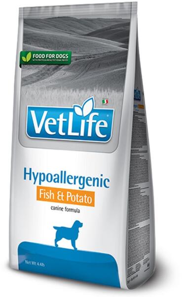 A Farmina Vet Life Hipoallergén Hal & Burgonya teljes értékű diétás eledel kutyáknak a táplálékintolerancia csökkentésére kifejlesztve. Bőr- és szőrproblémákkal, illetve kötőhártya-, külső hallójárat-, és a bűzmirigy gyulladásos megbetegedéseivel küszködő kutyák kiegészítő kezelésére is ajánlható. A táplálékintolerancia csökkentésére, hal- és burg