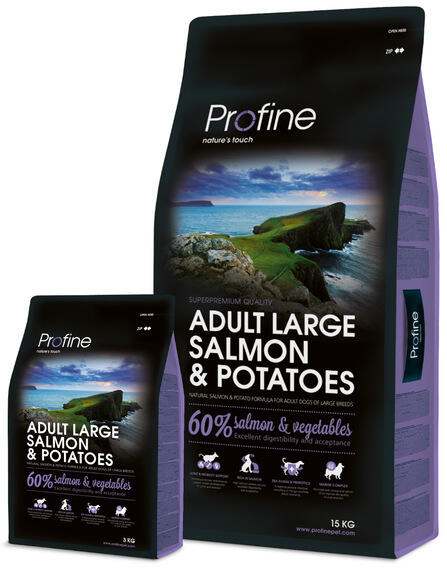 Összetevők: Lazac 42% (lazacliszt 26%, lazacprotein 16%), kukorica, burgonya (15%), szárított alma, csirkezsír (kevert tokoferolokkal tartósítva, E-vitamin forrás), sörélesztő, lazacolaj (3%), hidrolizált csirkemáj (2%), garnéla (1,5%), tengeri algák (0,5%), glükózamin-szulfát (0,025%), cikóriagyökér (mannán-oligoszacharidok forrása 0,02%), növényi keverék (édeskömény,