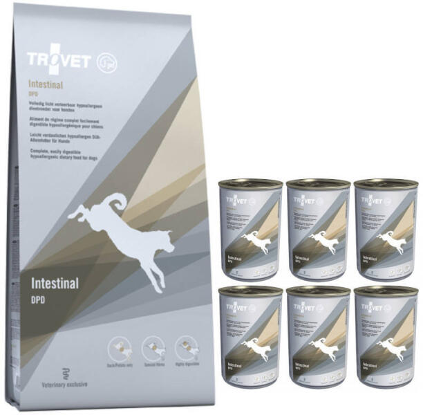 TROVET DPD Intestinal Kacsa & Burgonya kutyáknak 10kg - Leírás Diétás eledel táplálékintoleranciában, allergiában, gyomor- és bélrendszeri rendellenességekben szenvedő kutyák számára. A Trovet DPD táp válogatott fehérjéket tartalmaz, hogy kiküszöbölje az allergiát vagy ételintoleranciát okozó tápanyagokat. A Trovet DPD egy teljes értékű eledel, amelyet a legmaga