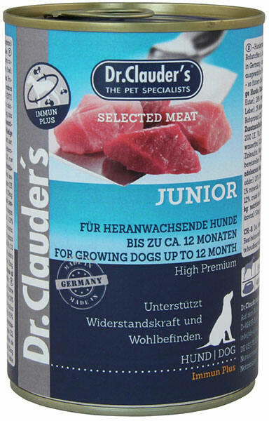 A Dr. Clauder’s Selected Meat Junior teljes értékű, 96% friss húst tartalmazó konzerv eledel kölyök kutyák részére valódi, ízletes hússal és béta-glükánnal. Megnövelt fehérje és energiatartalma megfelel a növekedésben lévő kölyök kutyák minden igényének. A válogatott marha , sertés és baromfi az állati fehérjék komplex keverékét biztosítják. A hozzáadott