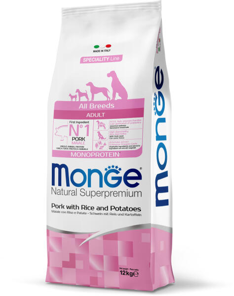 Kiszerelés:12kg Monge Dog Speciality Line Monoprotein Adult - Pork, Rice, Potato sertéshússal minden testméretű kutyának. -Monoprotein (kizárólag egy állati fehérjét tartalmaz) - prebiotikumokkal, vitaminokkal -Hozzáadott mesterséges színezékek és tartósítószerek nélkül -yucca schidigera(pozitv hatással van az emésztésre, és csökkenti a széklet kellemetlen szagát) - sö