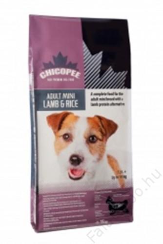 Chicopee Adult Mini Breed- Lamb & RiceTeljes értékű eledel apró termetű felnőtt kutyák részére, báránnyal és rizzsel. Összetétel: bárány húsliszt (min. 22,0%), rizs (min. 11,5%), kukorica, búzaliszt, búza, szárnyas zsír, szárnyas liszt, szárított cukorrépapép, búzadara, fehérje hidrolizát, szárított sörélesztő, cellulóz, kálium-klorid, nátrium-klorid, cikó