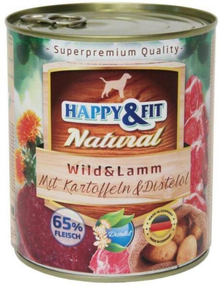 A Happy&Fit Natural konzerv vadhúsokkal, bárányhússal, burgonyával és sáfrányos szekliceolajjal , kizárólag természetes összetevők felhasználásával, 65%-os hústartalommal készült felnőtt kutyák számára, gabonamentesen. Mi teszi különlegessé a Happy&Fit Natural konzervet, amely felnőtt kutyáknak készült vadhúsokkal, bárányhússal, burgonyával és sáfrányo