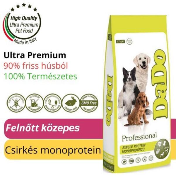 Komplett eledel minden fajta felnőtt kutyának, magas csirkehús tartalommal. Lazac olajat tartalmaz, amely az Omega 3 zsírsav forrása Cukor-, tartósítószer- és adalékmentek összetétel. A legjobb minőségú összetevőket tartalmazza, amelyek akár emberi fogyasztásra is alkalmasak lennének A válogatós kutyák ízlésének is megfelel Tartalmaz minden fontos tápanyagot, mint péld