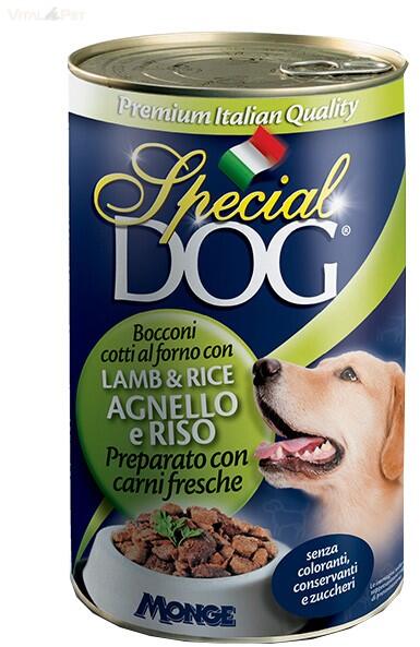 Special Dog konzerv 1275g bárány-rizs Sütőben főtt prémium darabok bárány- és rizzsel, minden fajtájú kutyának. Ideális napi étrendhez. Javított minőség kiváló minőségű hússal. Cukormentes. https://www. monge. it/wp-content/uploads/2016/02/special_do g_dog_wet_chunks_with_lamb_and_rice_GB. pdf Hús és melléktermékek 45% (bárány 6%), gabonafélék (rizs 4,5%), ásványi