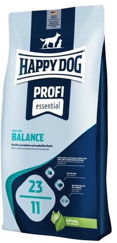A Happy Dog Profi Essential Balance egy teljes értékű állateledel, normál energiaszükségletű kutyáknak. Beltartalmi értékek: Nyersfehérje 23,0 %, nyerszsír 11,0 %, nyersrost 2,0 %, nyershamu 6,0 %, kalcium 1,3 %, foszfor 0,9 %, nátrium 0,25 %, omega-6 zsírsavak 2,0 %, omega-3 zsírsavak 0,2 % Összetétel : Gabonafélék (köztük zab, rizs, árpa), hús és állati melléktermékek